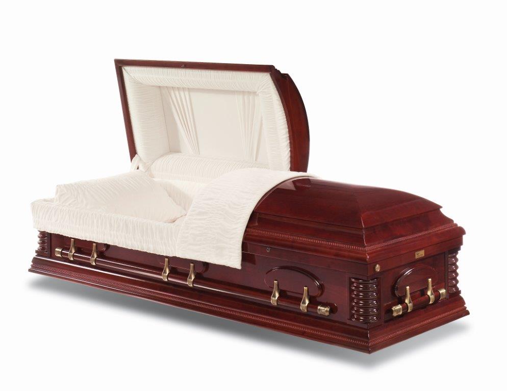 cherry finish. A superb solid poplar American casket, finished with an American cherry satin finish. Featuring decorative curved