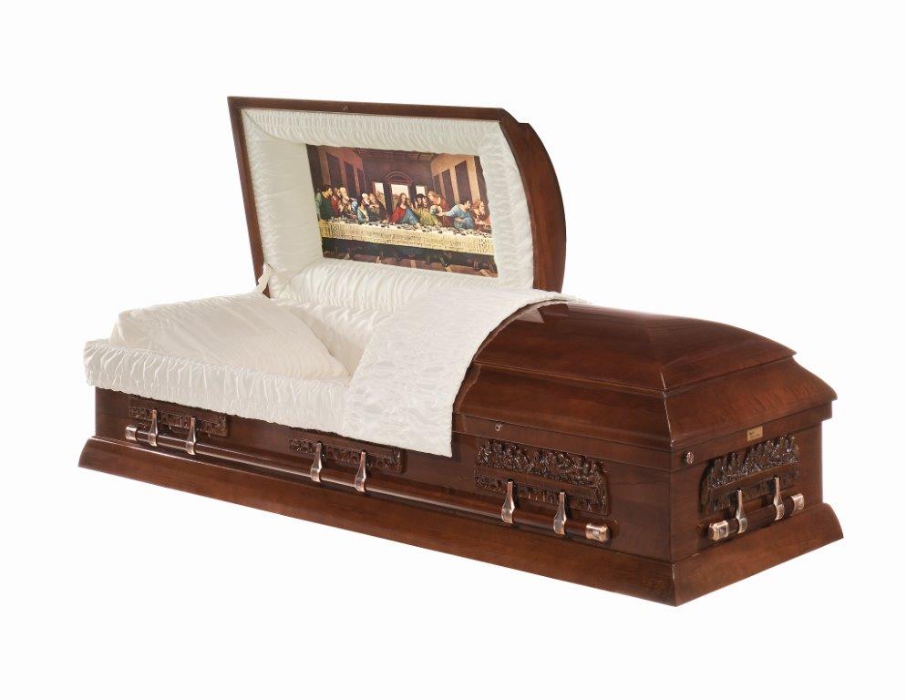 poplar casket An elegant, solid poplar casket with a high, deep gloss finish. Themed around the Last Supper by Leonardo da Vinci, this casket has matching bar handles with Last Supper engraved handle supports. This stunning casket has a tan crepe interior and an optional Last Supper lid panel and optional crucifix.